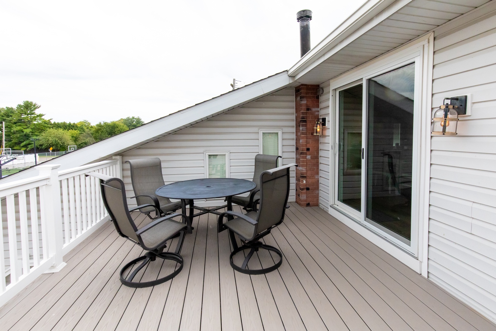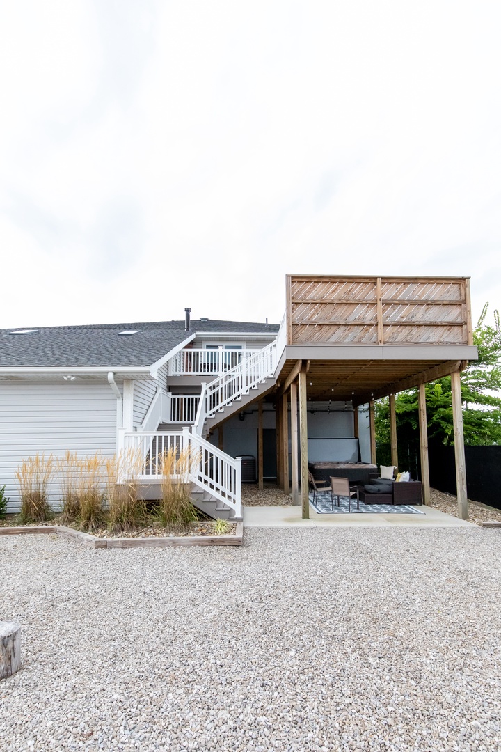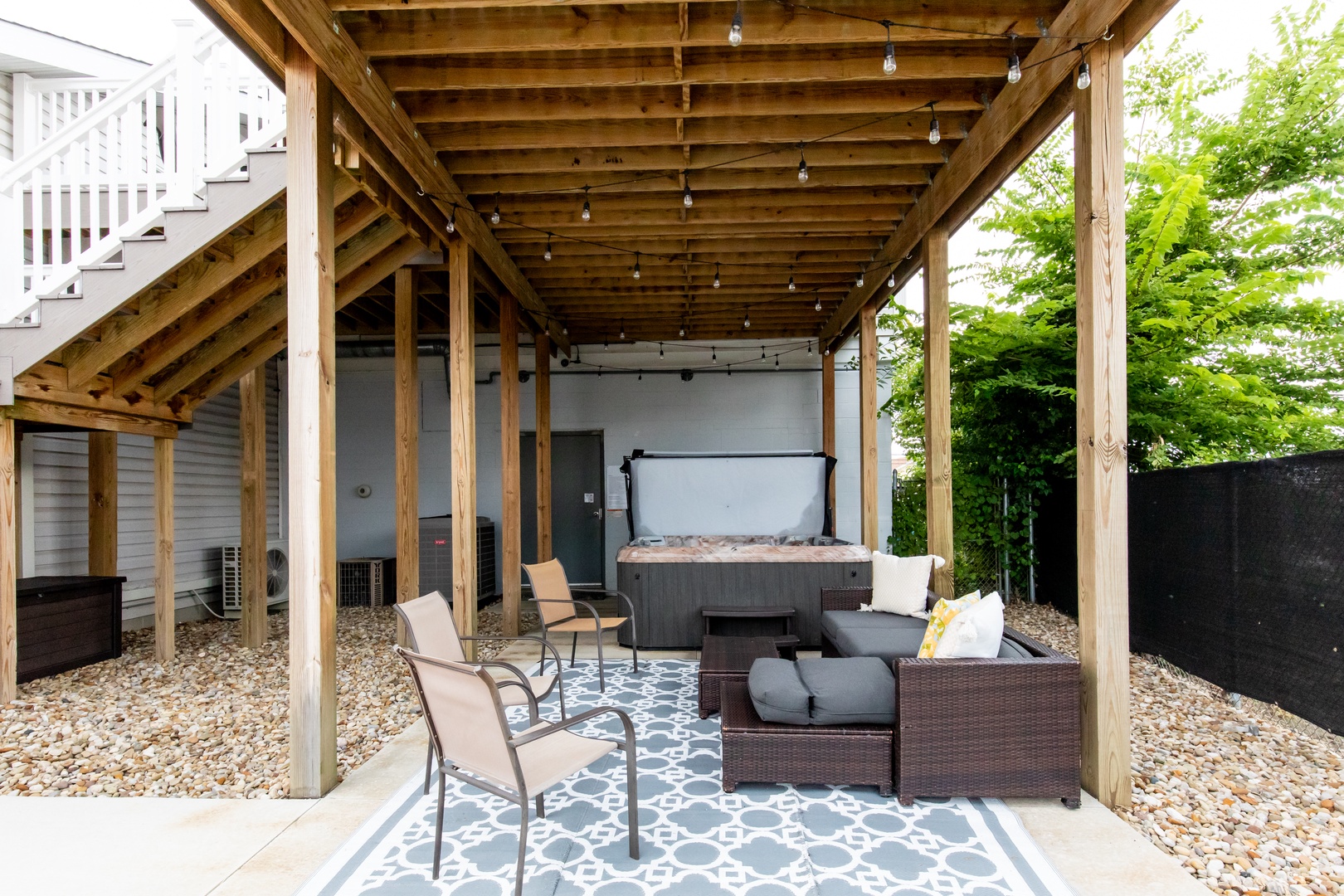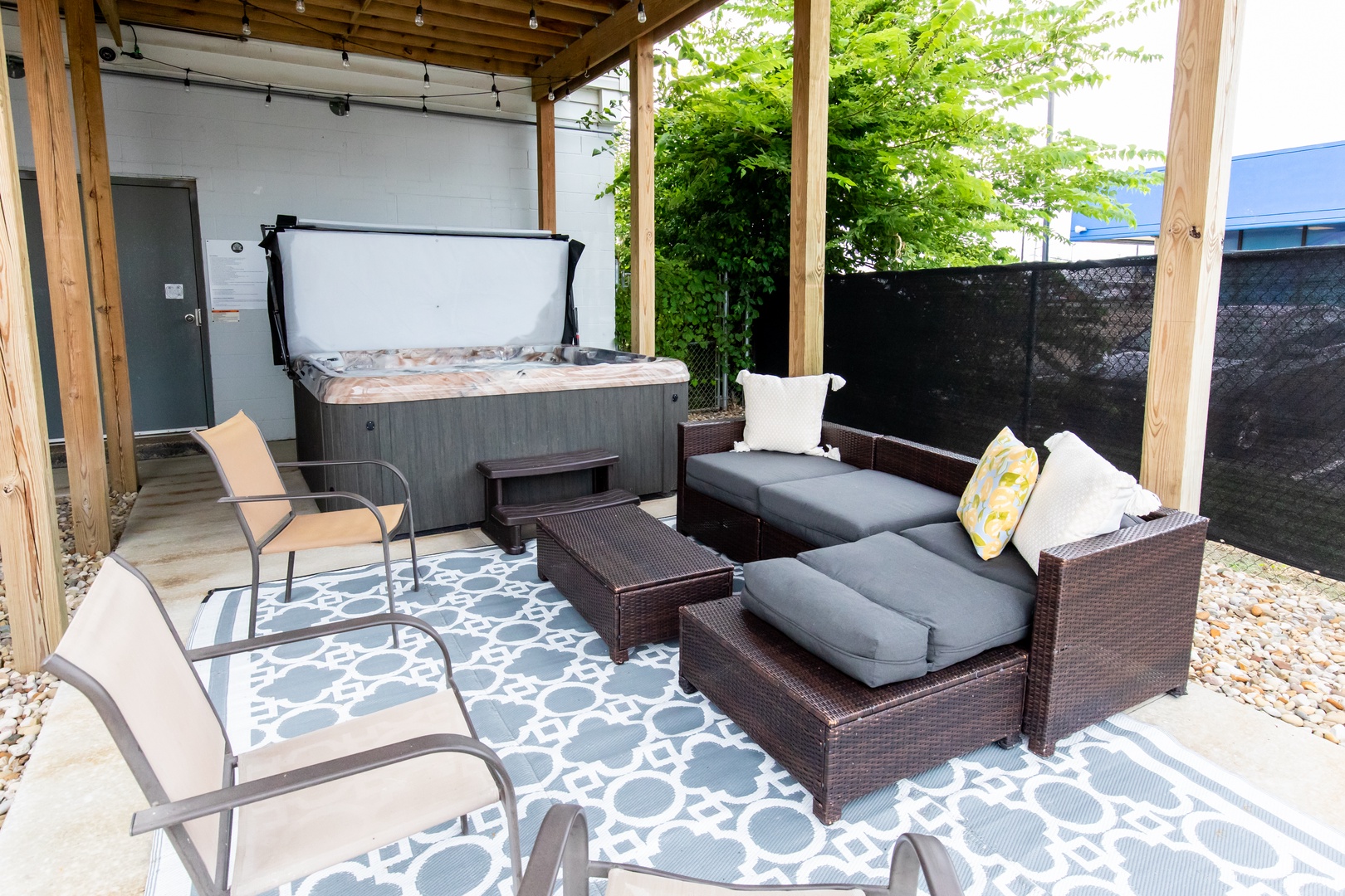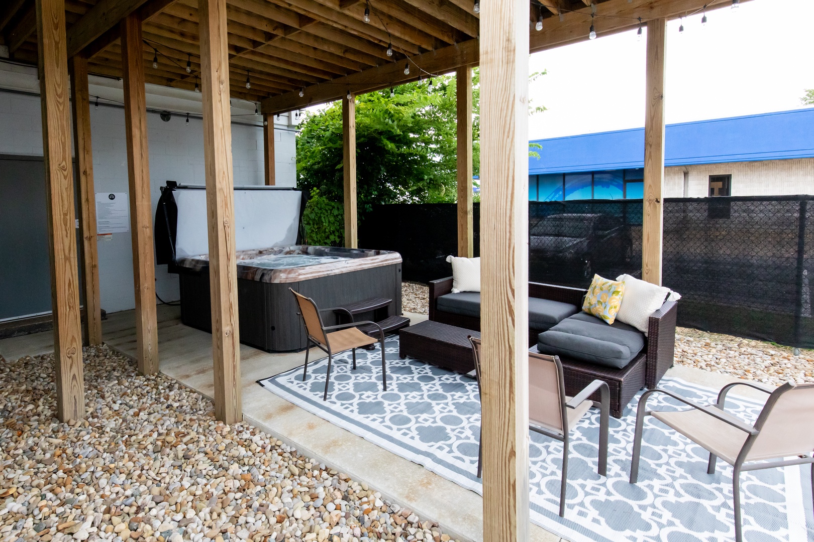 The two-level patio and balcony features plenty of space to spread-out. A propane-operated grill, ample seating, firepit, and hot tub are all available for use.