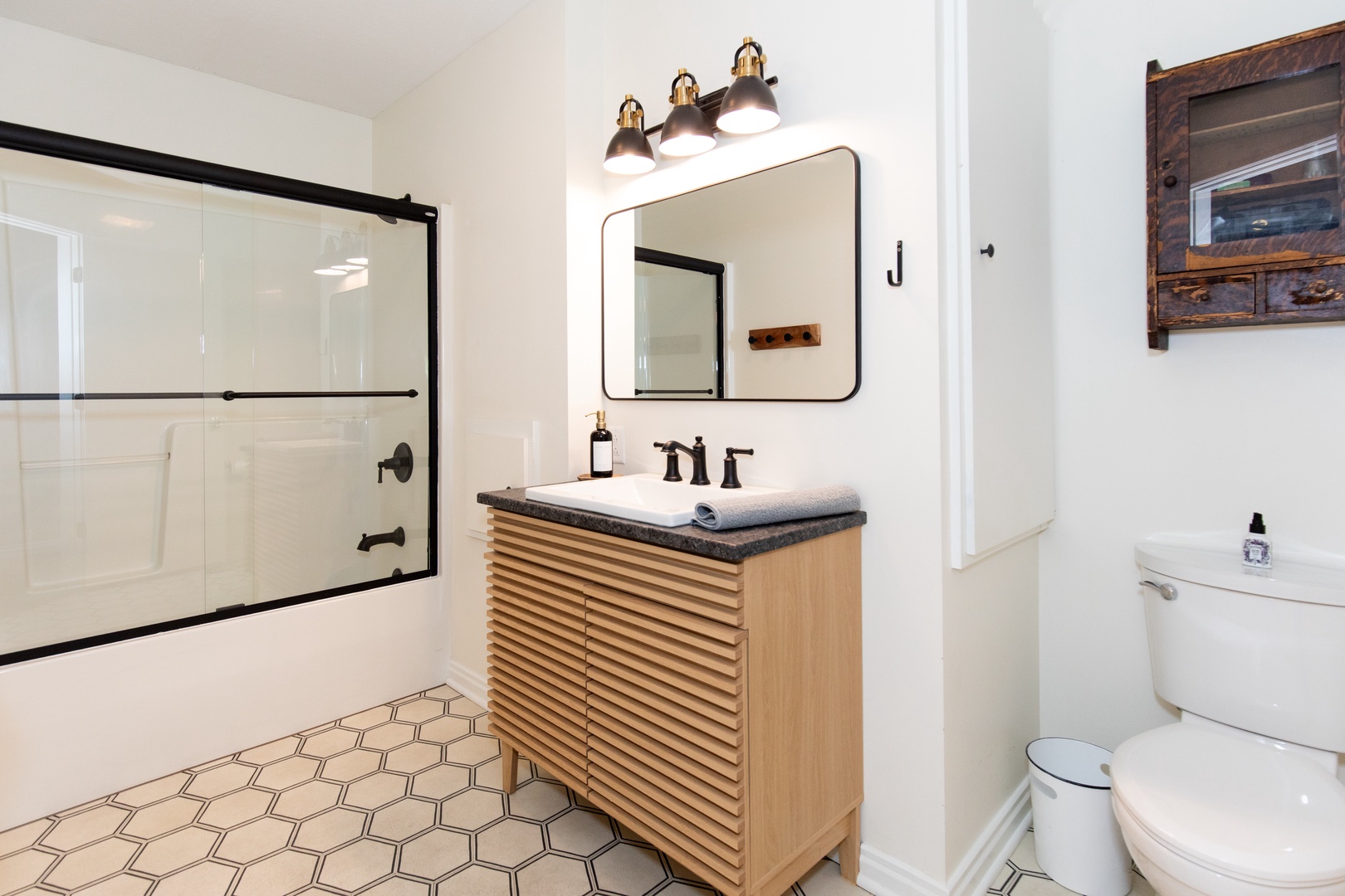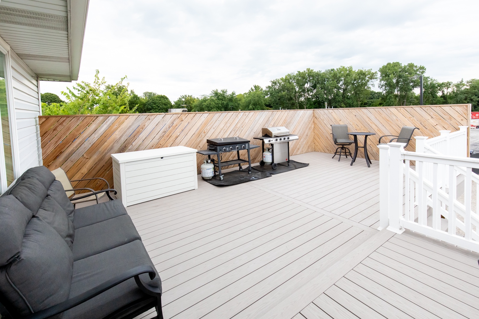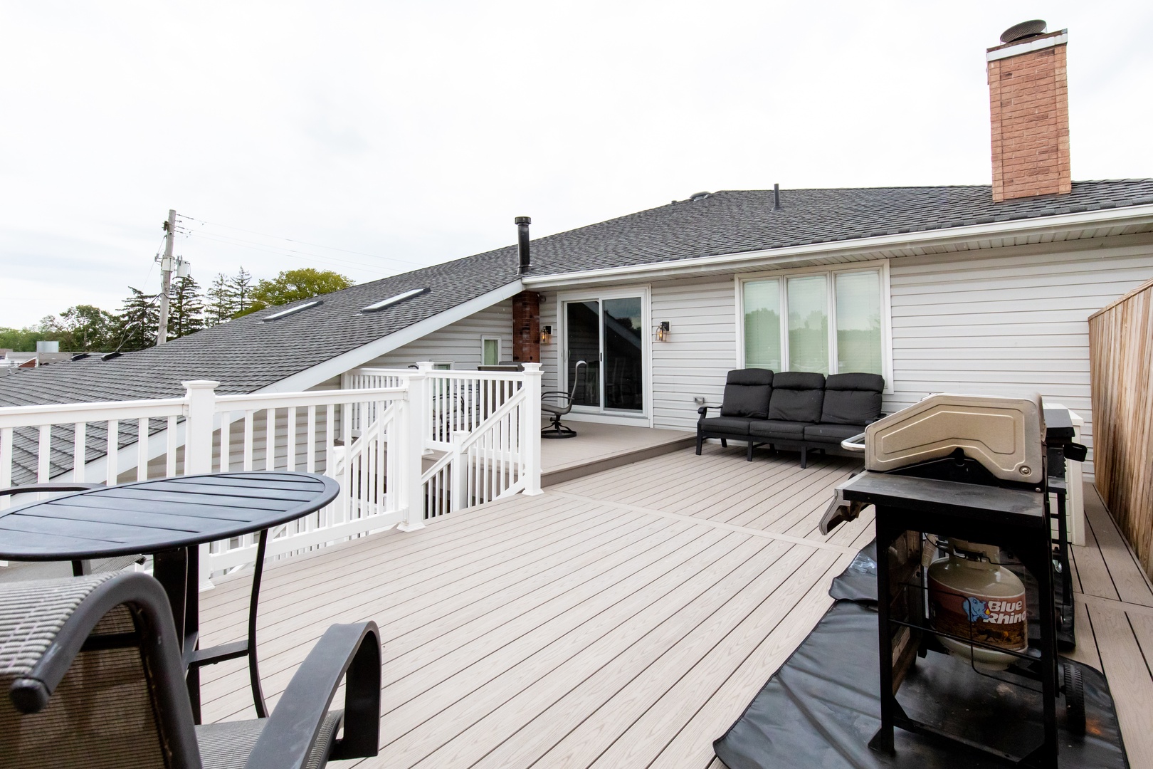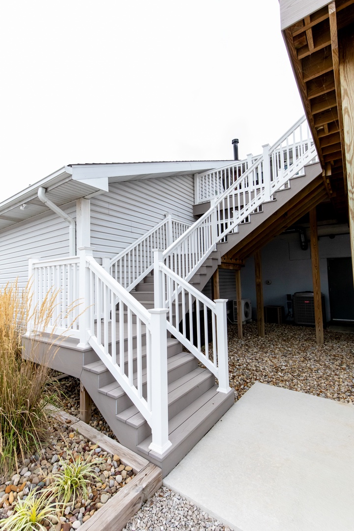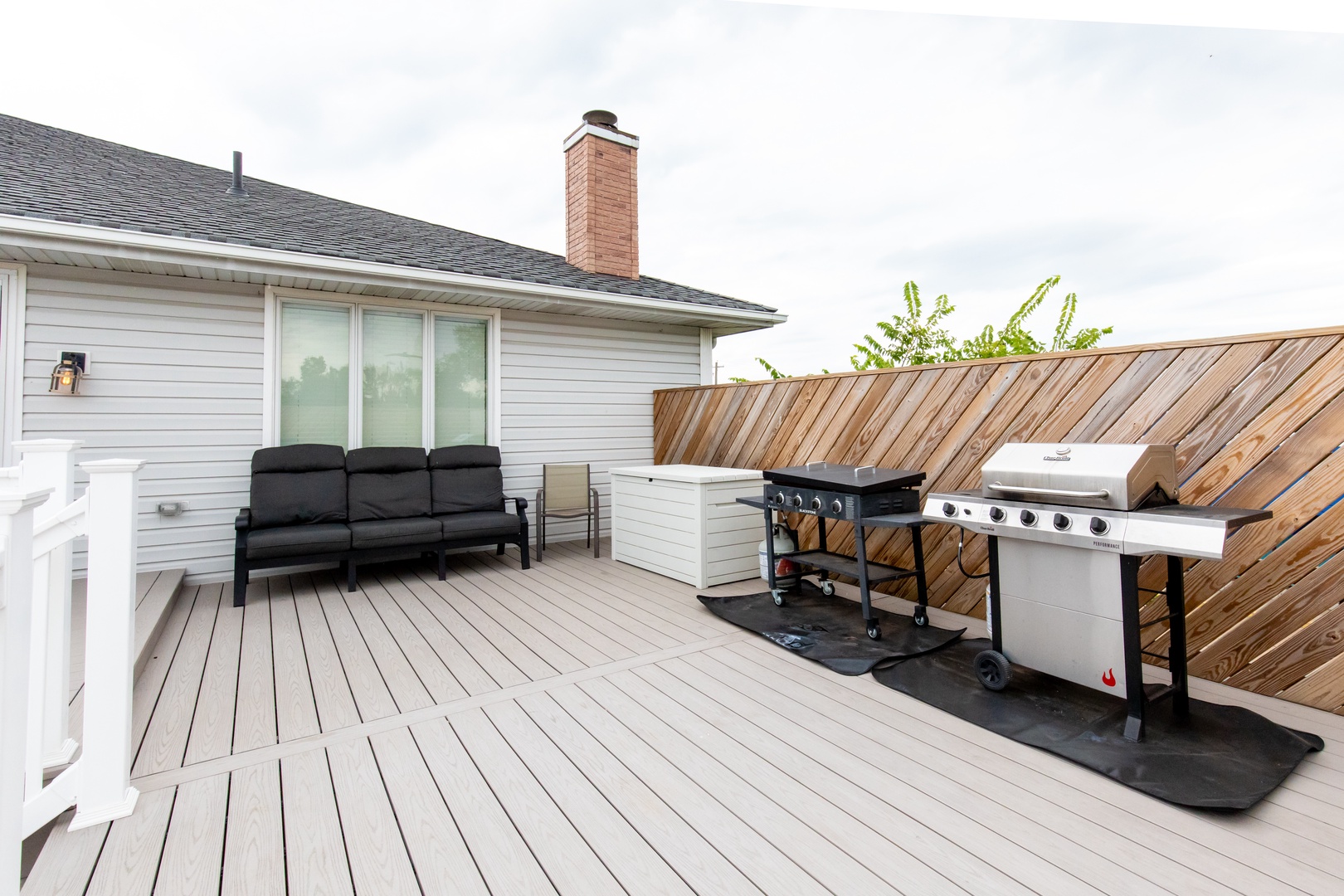 The two-level patio and balcony features plenty of space to spread-out. A propane-operated grill, ample seating, firepit, and hot tub are all available for use.