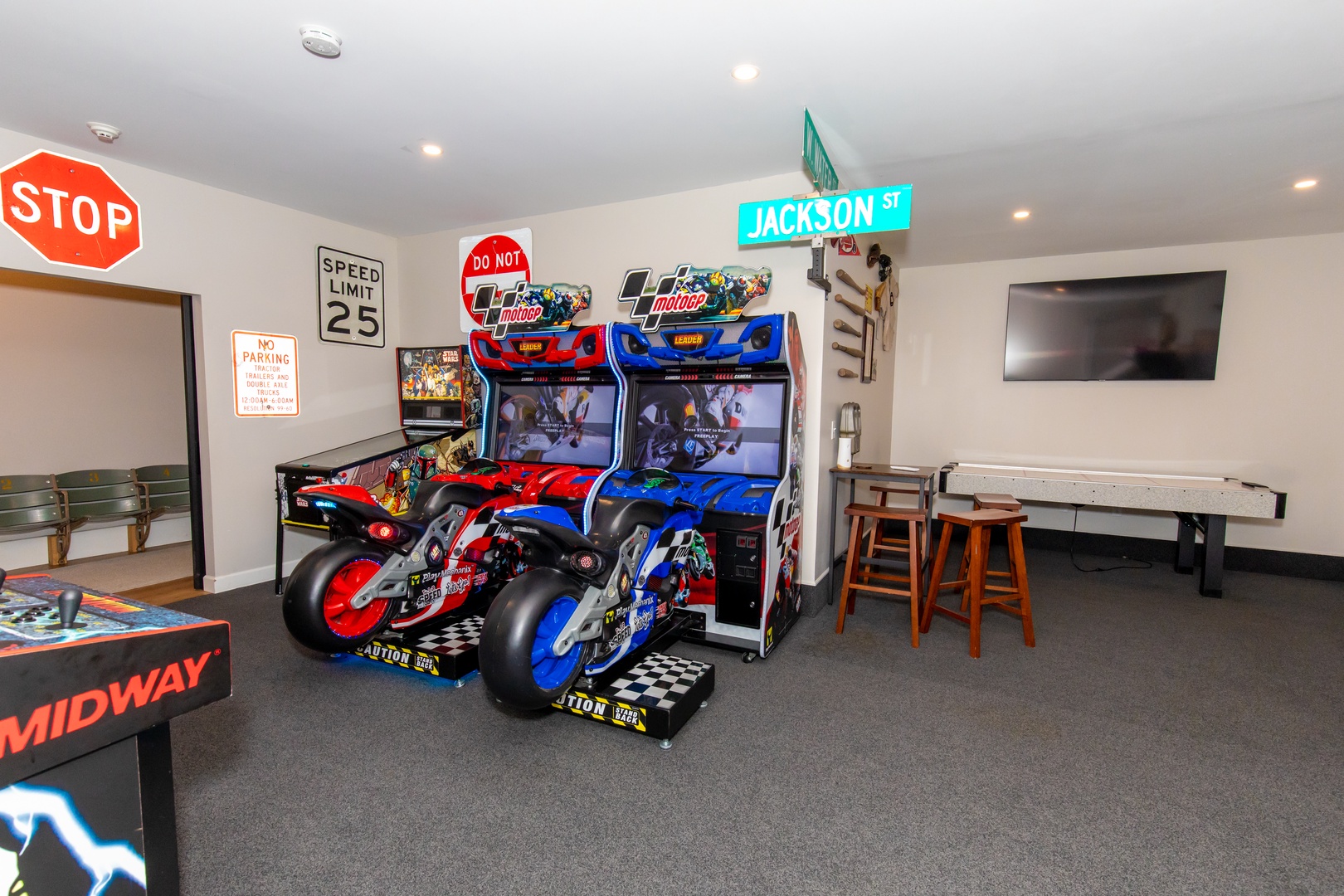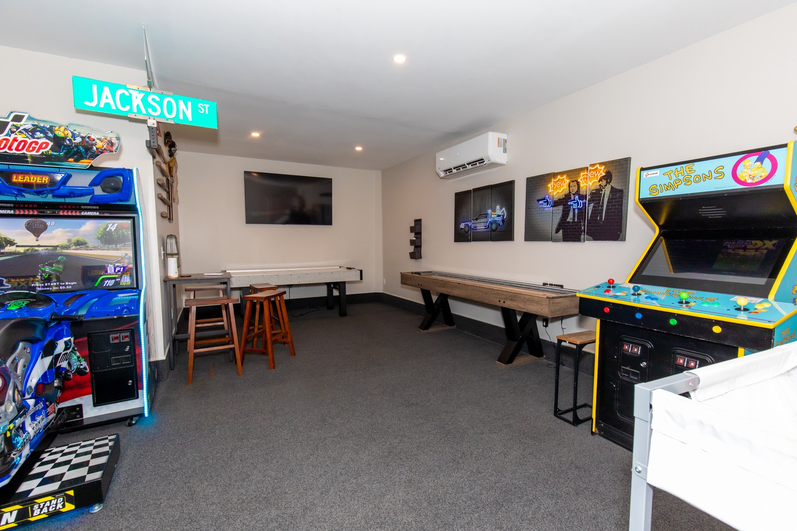 Upon entry to the Attic, we have a 500 square foot arcade loaded with vintage arcade games, basketball shootout, shuffleboard and a large 75" Television decked out with decor from the Cavaliers 2016 NBA Championship