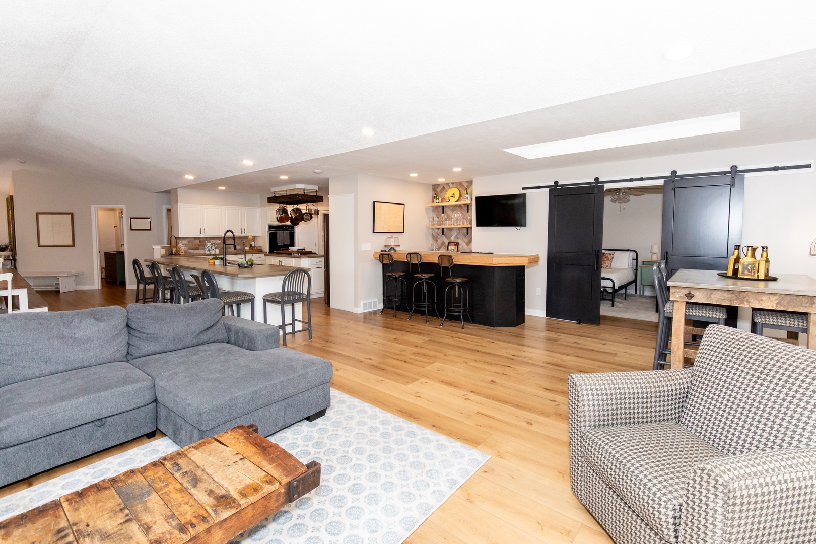 by Kathleen B.We stayed with some families from our travel baseball team in town for a tournament. It was a really great space. We had 13 and could have fit 16-17. Kitchen was great, family room was comfortable, fire pit was fun, and arcade was amazing. Only thing missing was a pool for adults not going to the amusement park. But highly recommended and would stay again with a larger group. It is over a business- but that was not an issue. It was also close to the train tracks - so at night there was some train noise. Also no blackout shades on windows facing east - could have been helpful. But neither of those would deter me from staying again. Was a terrific space overall and a fun stay.